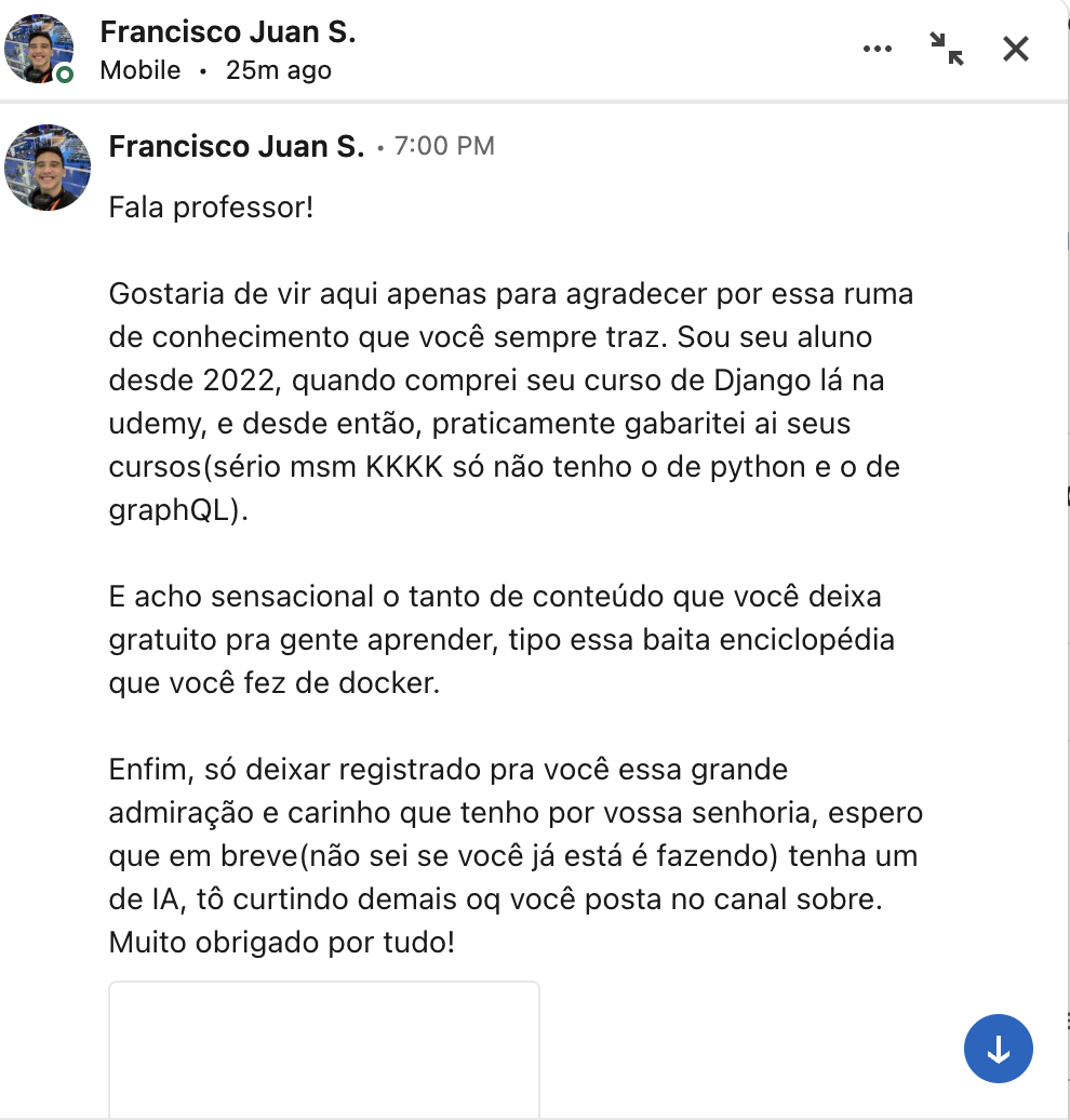 "Fala professor! Gostaria de vir aqui apenas para agradecer por essa ruma de conhecimento que voce sempre traz. Sou seu aluno desde 2022 e, desde entao, praticamente gabaritei seus cursos. Acho sensacional o tanto de conteudo gratuito que voce deixa pra gente aprender, tipo essa baita enciclopedia que voce fez de docker. Enfim, deixo registrado minha admiracao e carinho. Muito obrigado por tudo!"