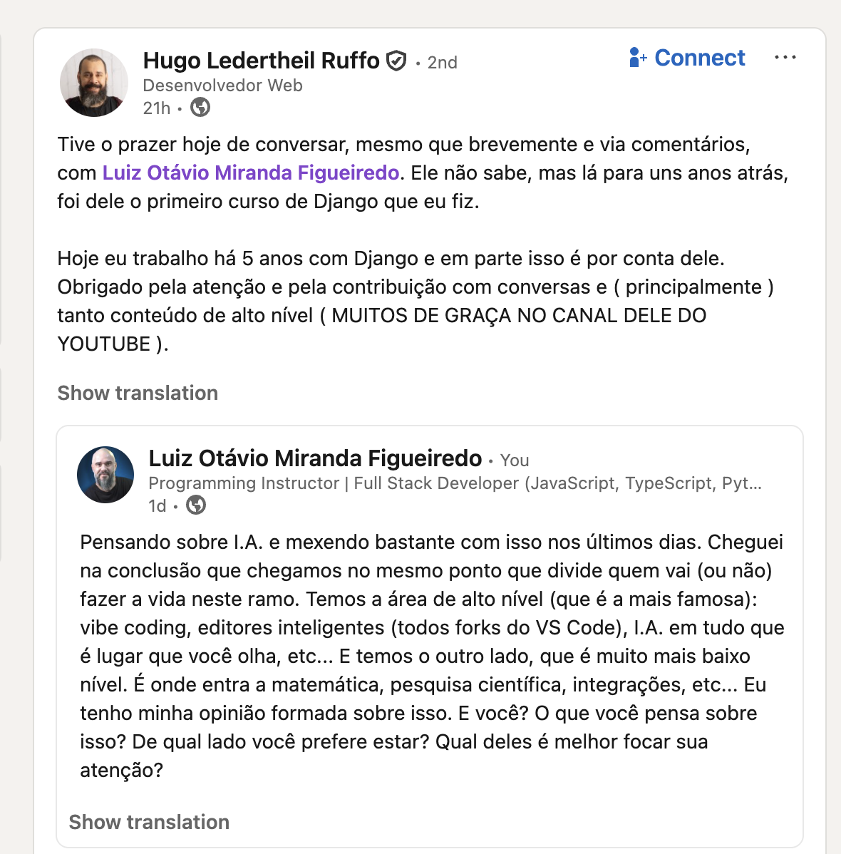 "... Hoje eu trabalho há 5 anos com Django e em parte isso é por conta dele (Otávio Miranda). Obrigado pela atenção e pela contribuição com conversas e ( principalmente ) tanto conteúdo de alto nível (MUITOS DE GRAÇA NO CANAL DELE DO YOUTUBE)."