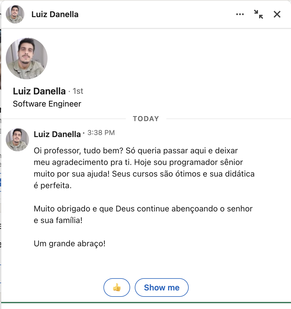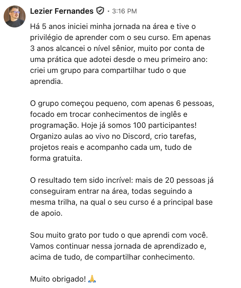 "Há 5 anos iniciei minha jornada na área e tive o privilégio de aprender com o seu curso. Em apenas 3 anos alcancei o nível sênior... Sou muito grato por tudo o que aprendi com você. Vamos continuar nessa jornada de aprendizado e, acima de tudo, de compartilhar conhecimento. Muito obrigado!"