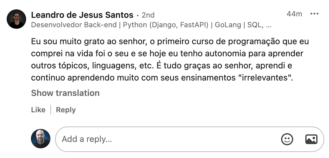 "Eu sou muito grato ao senhor, o primeiro curso de programação que eu comprei na vida foi o seu e se hoje eu tenho autonomia para aprender outros tópicos, linguagens, etc. É tudo graças ao senhor..."