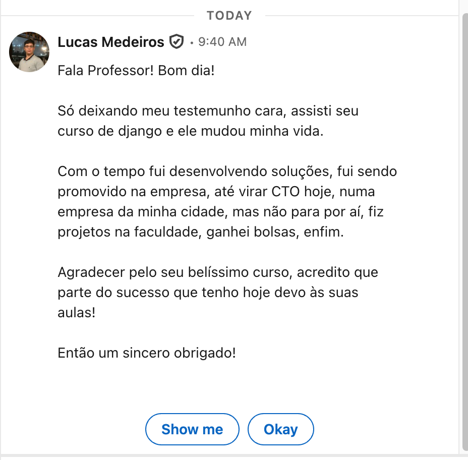"...Seu curso de django e ele mudou minha vida. Com o tempo fui desenvolvendo soluções, fui sendo promovido na empresa, até virar CTO hoje, numa empresa da minha cidade, mas não para por aí, fiz projetos na faculdade, ganhei bolsas, enfim. Agradecer pelo seu belíssimo curso, acredito que parte do sucesso que tenho hoje devo às suas aulas! Então um sincero obrigado!"